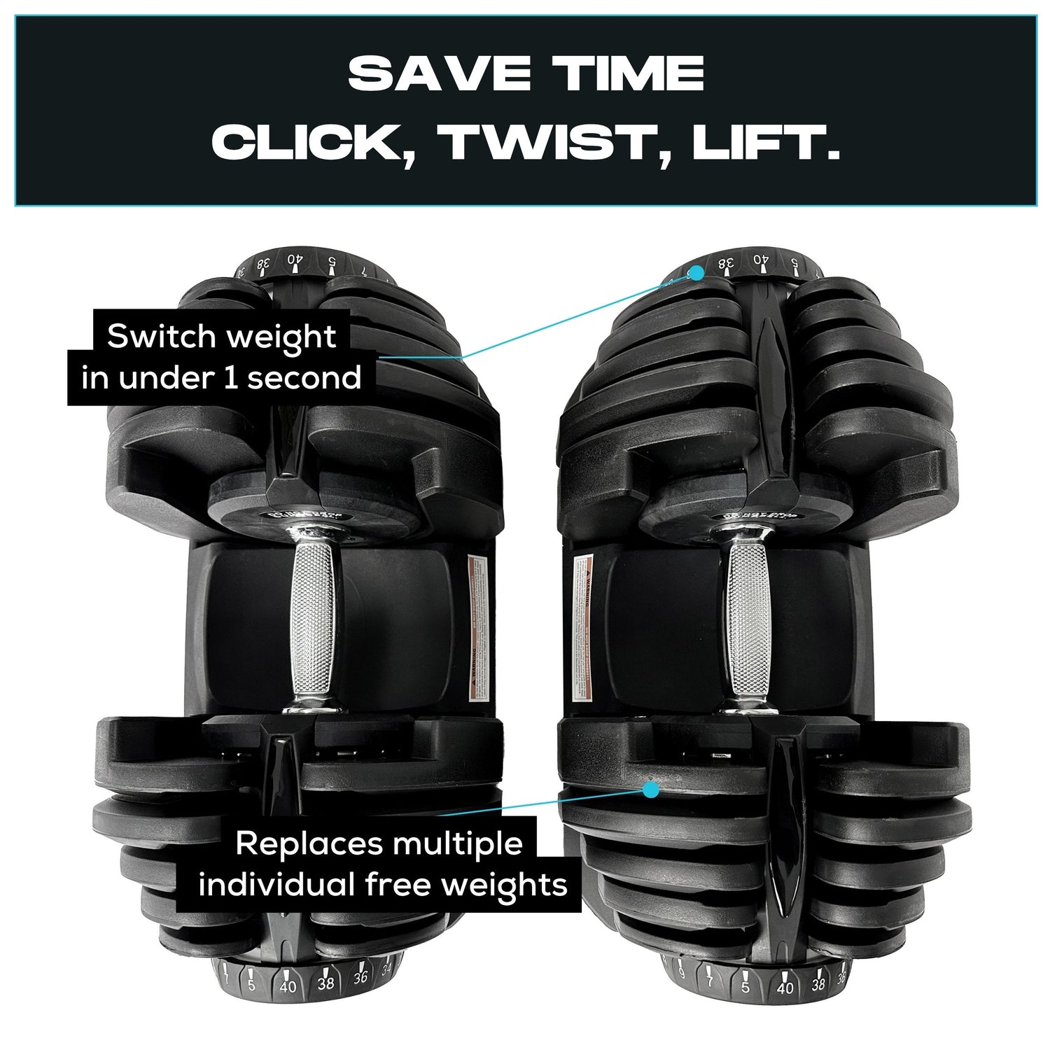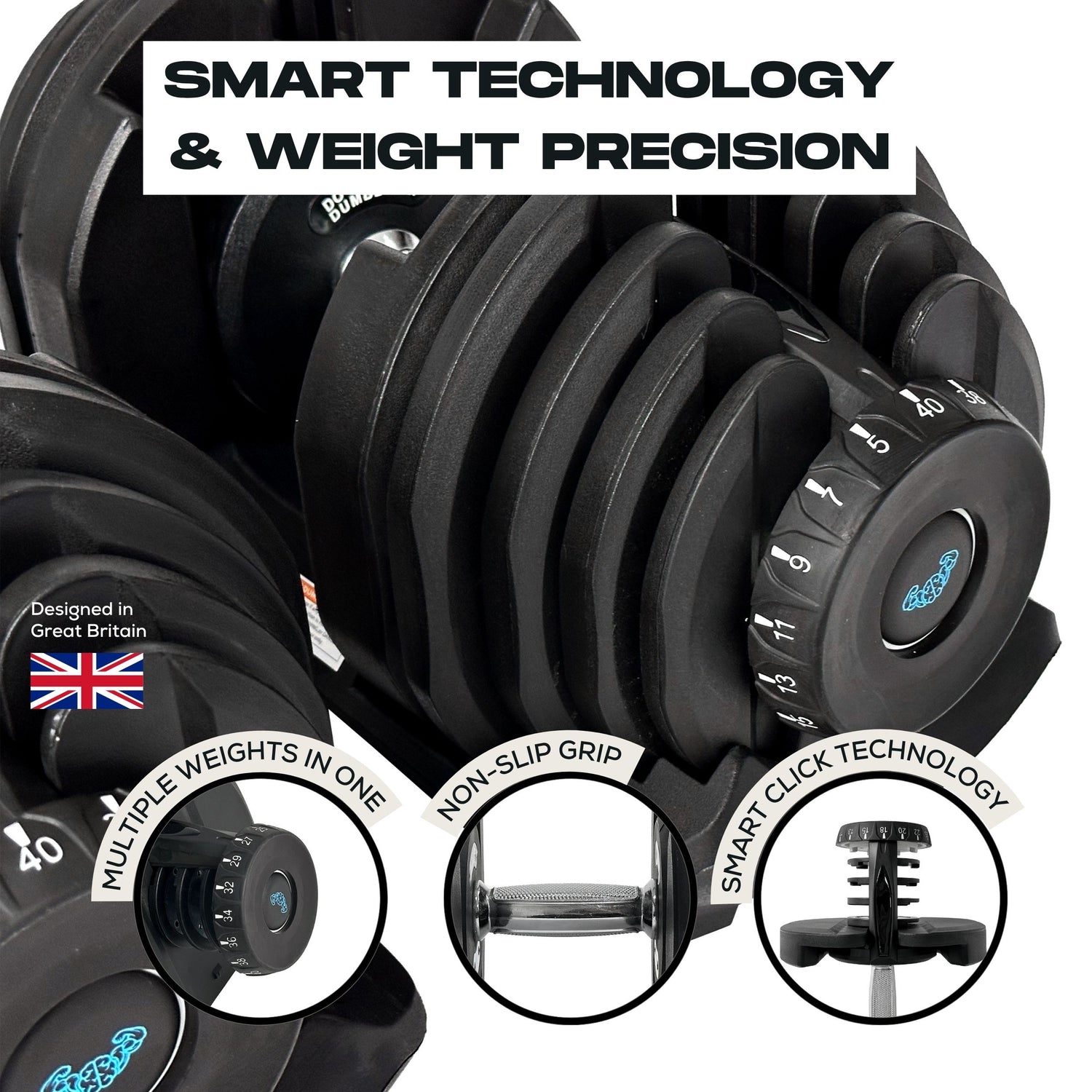 Explore the key features of our 40kg Adjustable Dumbbell (Pair) by clicking on the pulsing highlights.